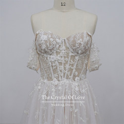 Tessuto di pizzo con abiti da sposa a fiori 3D, abito da sposa a trapezio, abito color champagne chiaro