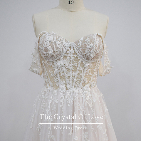 Tecido do laço com vestidos de noiva flor 3D, vestido de noiva linha luz champanhe cor